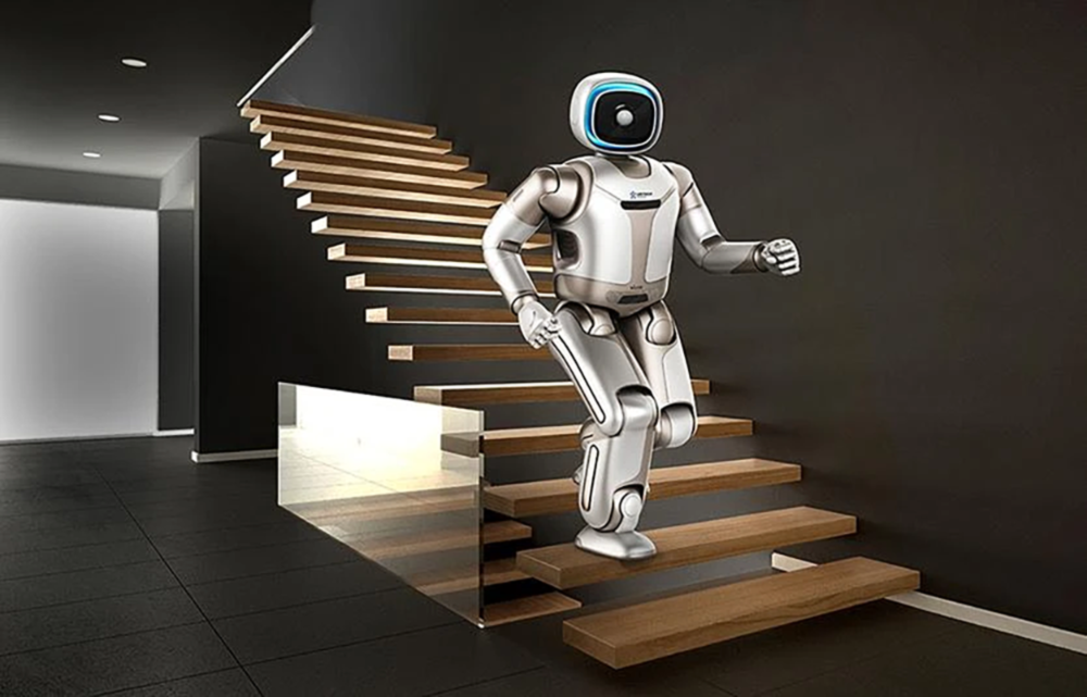 "Walker is your agile smart companion—an intelligent, bipedal humanoid robot that aims to one day be an indispensable part of your family. Standing 4.75 feet (1.45 m) tall and weighing 170 lbs (77 kg), the new version of Walker is more advanced than ever, including arms and hands with the ability to grasp and manipulate objects, a refined torso with improved self-balancing, smooth and stable walking in difficult environments, and multi-modal interaction including voice, vision, and touch. Walker has 36 high-performance actuators and a full range of sensing systems that work together to insure smooth and fast walking."